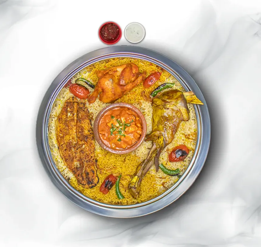 حنید شانه٬ ماهی هامور تندوری٬ مندی نصف مرغ٬ چکن هاندی٬ نان خشک یمنی٬ سوپ٬ سلاد٬ چتنی