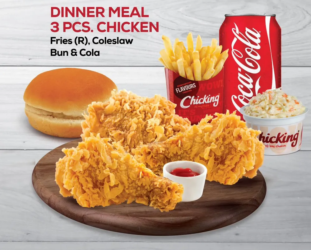 3 Pieces fried chicken Fries (R) Coleslaw Bun Cola
