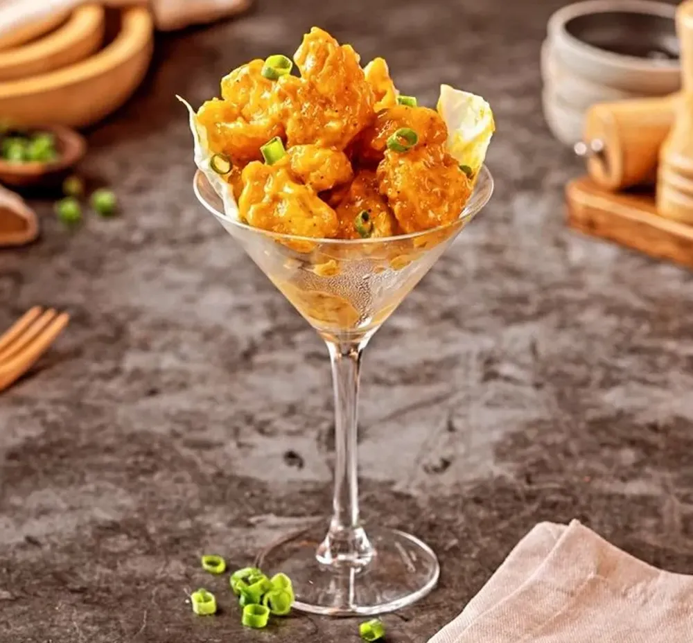 Crispy fried shrimp tossed with spicy and tangy sauce, delivering a bold and flavorful taste. Allergen note: Contains shellfish and egg; May cause allergies.