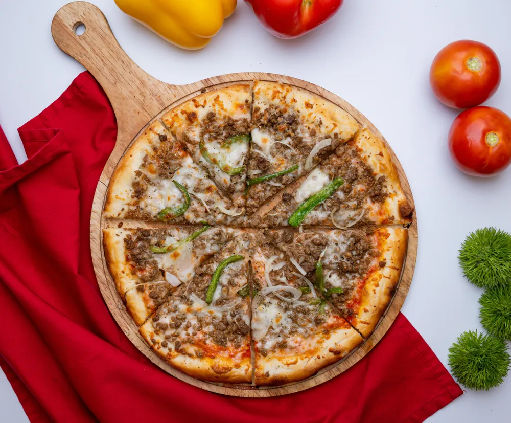 A crispy crust layered with juicy beef slices, rich tomato sauce, melted mozzarella, and aromatic Italian herbs for a hearty flavor. Allergen note: Contains gluten and dairy; may cause allergies