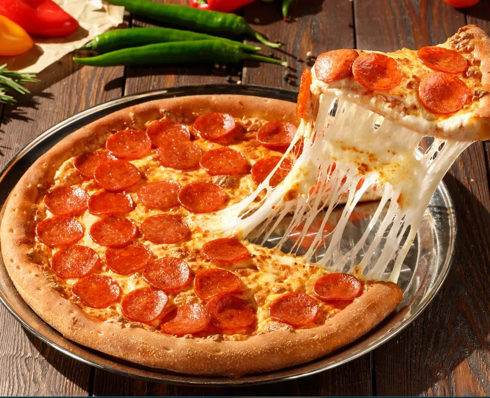A crispy crust loaded with spicy pepperoni slices, melted cheese, and tangy tomato sauce, baked to perfection for a bold flavor. Allergen note: Contains gluten and dairy; may cause allergies