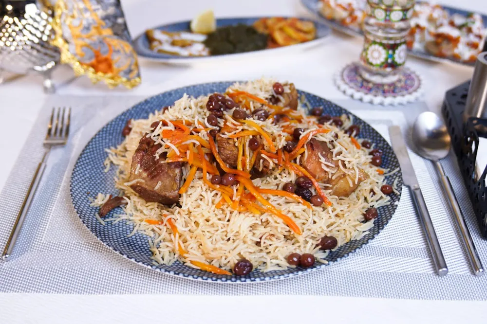 Fragrant basmati rice cooked with tender lamb or chicken, caramelized carrots, raisins, and aromatic spices for a classic Afghan dish.