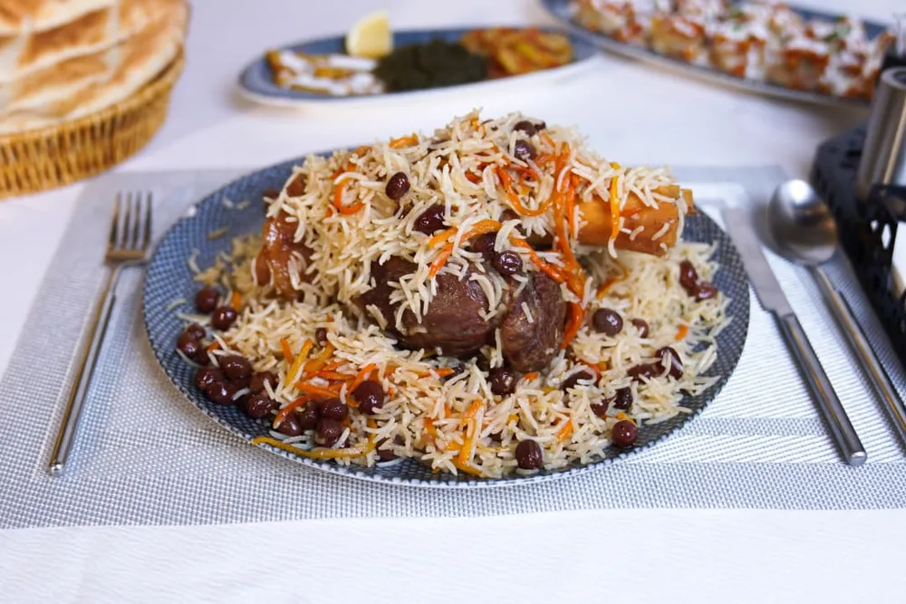 Tender lamb shank slow-cooked with aromatic spices and served over fragrant basmati rice, creating a rich and hearty Afghan specialty.