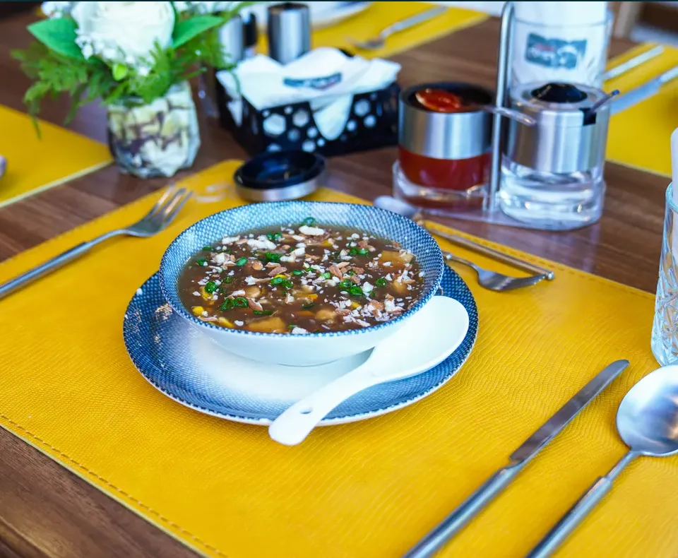 A chef's signature soup made from a rich blend of fresh vegetables, tender chicken and aromatic herbs served warm and full of flavours.