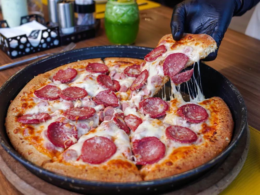 Crispy pizza base topped with spicy pepperoni slices, cheese, tomato sauce, and fresh vegetables, baked to perfection. Allergen note: Contains gluten (dough) and dairy (cheese); may cause allergies