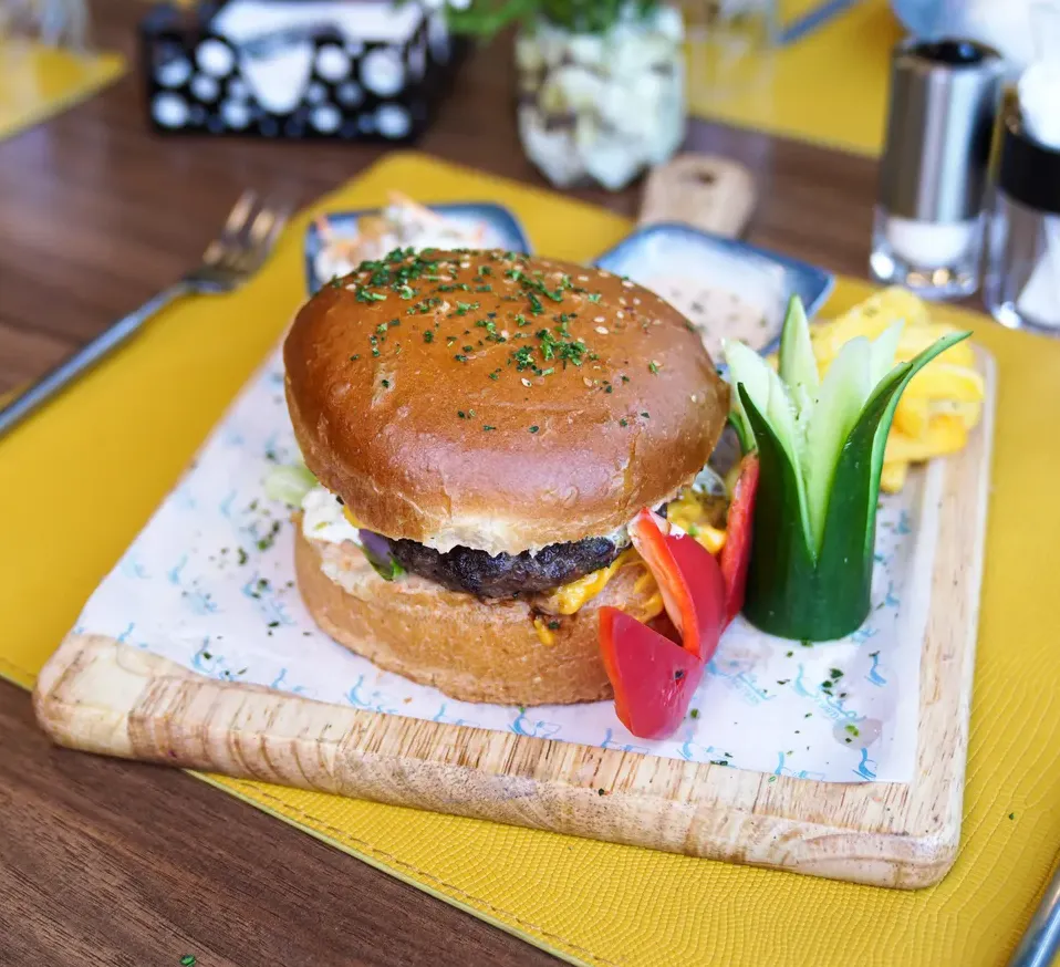 A flavorful beef burger with a smashed patty, served in a bun with lettuce, tomato, cheese, and a special sauce for a satisfying taste. Allergen note: Contains gluten (bun), dairy (cheese, sauce), ... Read More