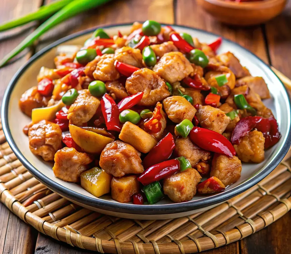 Tender chicken pieces stir-fried with Szechuan sauce, bell peppers, onion, garlic, and a hint of chili, offering a spicy and aromatic Asian flavor. Allergen note: May contain soy (from sauce) and s... Read More