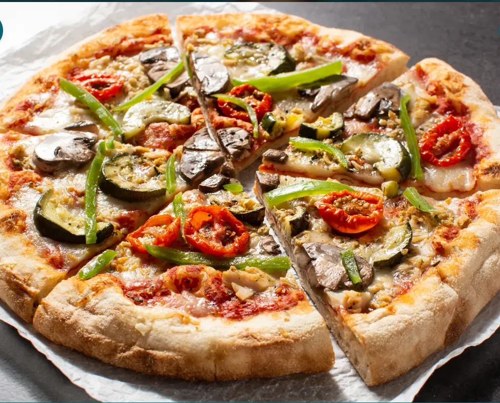 A golden crust loaded with fresh vegetables, melted cheese, and tomato sauce, baked to a vibrant and tasty perfection. Allergen note: Contains gluten and dairy; may cause allergies