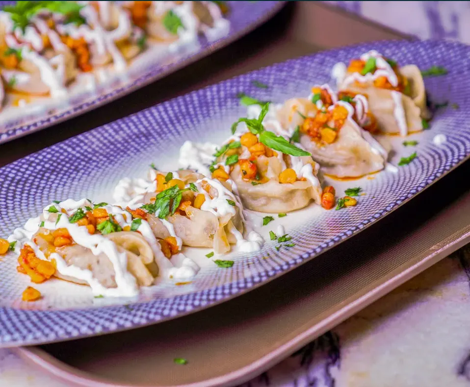 Steamed dumplings filled with seasoned minced meat (usually beef or lamb) and onions, served hot with yogurt, garlic sauce, and optional tomato-based sauce.