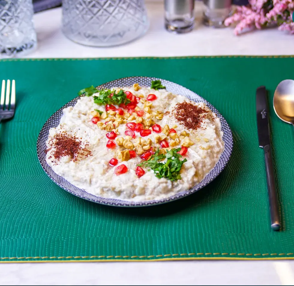 A creamy roasted eggplant dip blended with tahini, garlic, lemon juice and olive oil, offering a smokey and flavorful taste. Allergen note: Contains sesame (tahini); may cause allergies.
