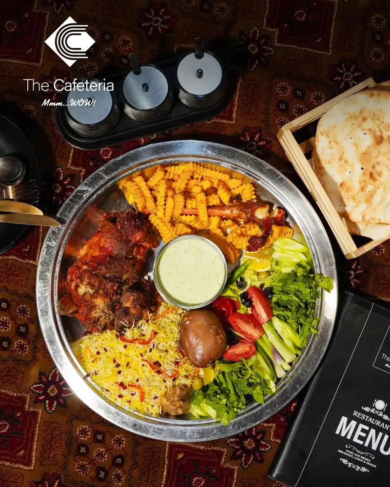 Combination of Qabili palaw, mandi yamani, tikka kabab, shami kabab, quil kabab, dahka fish(fish without bone), manto, boiled vegetables, house salad, custrad or deserts and 6 can of soft drinks,